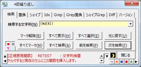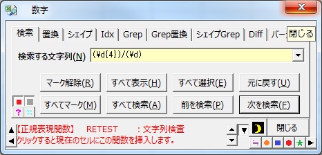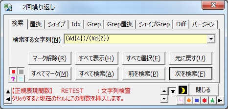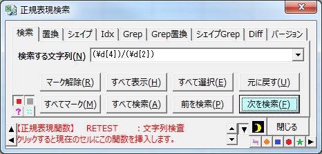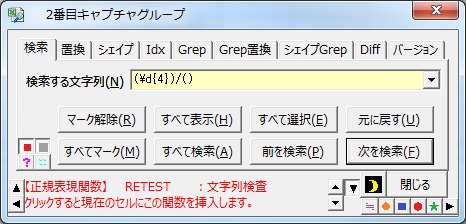 検索する文字列入力時に、入力中の正規表現の構文についての説明をタイトルバーに表示します。 入力した正規表現について確認できるので、初級者〜中級者にお勧めの機能です。 表示例として、検索する文字列に「(\d{4})/(\d{2})」を入力していきます。 また、入力済の検索する文字列の該当部分にキーボードやマウスでカーソルを移動させると、 その部分の正規表現の説明をタイトルバーに表示します。 この機能をオフにするには、設定タブの表示2タブの「入力説明非表示」をオンにします。