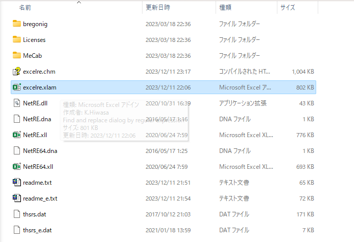ダウンロードした圧縮ファイルを展開後、「excelre.xla」をダブルクリックします。