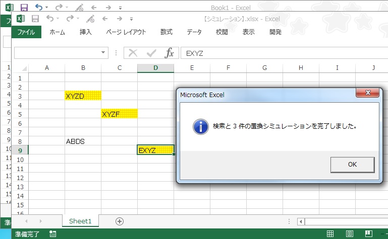 置換タブで検索条件と置換内容を入力して、すべて置換ボタンでシミュレーションを実行します。