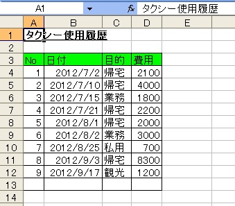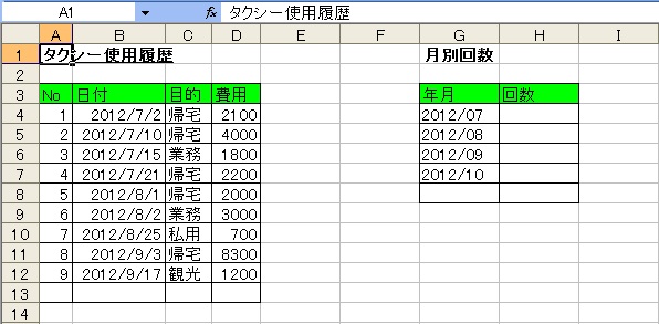以下のようなタクシー使用履歴の表から月別回数をカウントします。