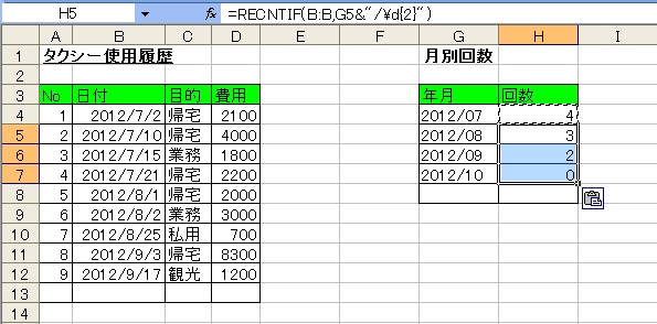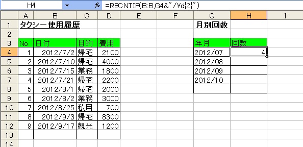 そこでH4セルに、「=RECNTIF(B:B,G4&"/\d{2}")」と入力します。