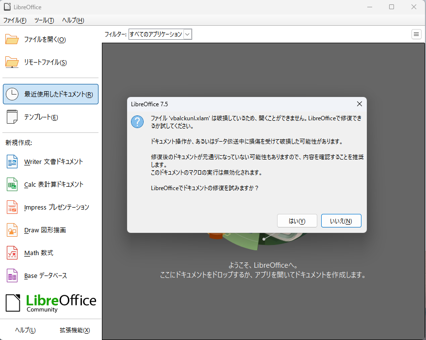 LibreOfficeでの修復もできないので、LibreOfficeでコードを見ることはできません。