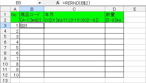 B3セルに「=RERND(B$2)」と入力します。
